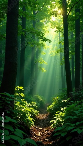 Naklejka premium Dense foliage and dappled light in a forest clearing, foliage, greenery, forest