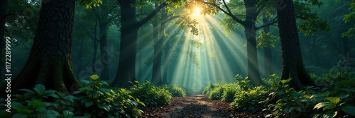 Fototapeta premium Dense foliage blocks sunlight, casting eerie shadows, dark woods, mystic...