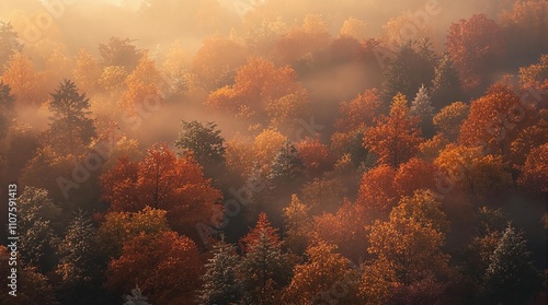 © Sarayuth, Naklejka premium Dense foliage in soft focus with autumnal trees, muted colors, forest atmosphere, earthy tones