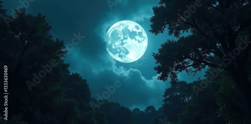 Naklejka premium Dense foliage obstructs the full moon above, casting eerie shadows, overcast,...