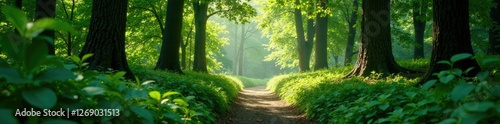 Obraz premium Dense foliage obstructs the path into the forest, dappled light, branches,...