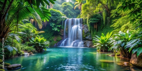 Fototapeta premium Dense foliage of exotic plants surrounding a serene waterfall , natural scenery