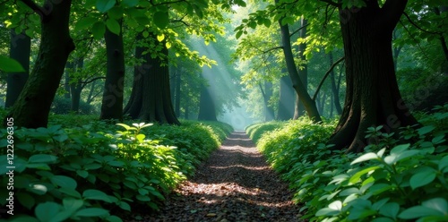 Naklejka premium Dense foliage surrounding a narrow forest path leading into the shadows,...