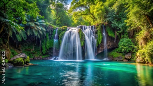 © Watcharapon, Obraz premium Dense foliage surrounds a serene waterfall cascading into a crystal-clear pool , waterfall, water, waterfall, water, landscape