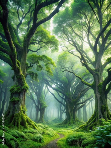 Naklejka premium Dense foliage with misty atmosphere amidst ancient trees