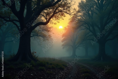 Obraz premium Dense forest at dusk with misty atmosphere and twisted tree branches, gloomy,...