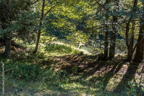 © Yi, Fototapeta premium dense forest by the river on a sunny day with green grasses filled river bank