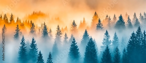 Obraz premium Dense forest covered in colorful atmospheric morning mist