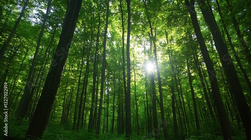 © Generative AI, Naklejka premium Dense Forest Filled with Green Trees and Sunlight Filtering Through the Canopy : Generative AI