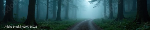 Fototapeta premium dense forest fog envelops a winding dirt path, solitude, mist, trees