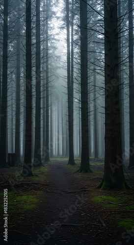© nuril, Naklejka premium Dense forest pathway through tall trees in foggy morning light