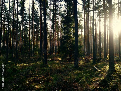 Fototapeta premium Dense forest scene with sunlight filtering through tall trees and dense...