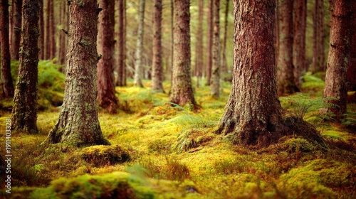 Obraz premium Dense Forest Scene with Tall Trees and Vibrant Green Moss Underfoot in Natural Environment