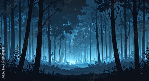 Obraz premium Dense forest silhouettes glowing faintly on anime background