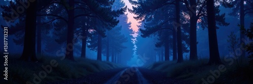 Fototapeta premium Dense forest twilight shadows deep blues purples and greens, trees, twilight,...