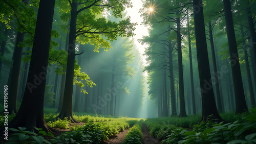 Naklejka premium Dense forest view capturing trees in various life stages - from saplings to towering mature trees - wide format
