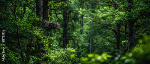 Obraz premium Dense forest view featuring lush green foliage and tall trees in a natural environment scene