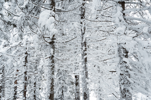 Fototapeta premium Dense forest with frozen branches. Winter atmosphere of forest travel, soft snow on trees