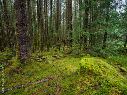 Fototapeta premium Dense forest with huge amount of green moss. Nature scene background. Nobody.
