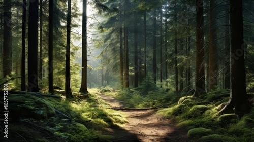 Obraz premium Dense forest with old spruce, fir, and pine trees, sunlight filtering through green leaves, serene atmosphere