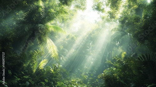 Obraz premium dense forest with soft sunlight filtering through the trees dappled light and...