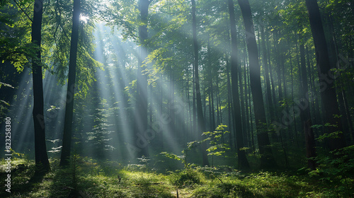 Fototapeta premium Dense forest with sunbeams filtering through the trees.