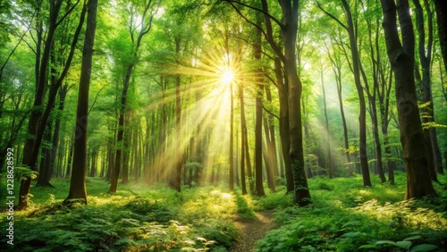 Obraz premium Dense Forest with Sunlight Filtered Through Leaves, outdoors, ,...
