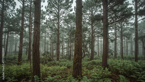 © Sona, Fototapeta premium Dense forest with tall pine trees and lush green undergrowth.