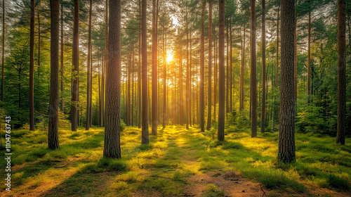 Fototapeta premium dense forest with tall pine trees, dappled sunlight filtering through the canopy, serene atmosphere