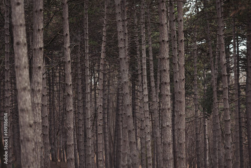 Obraz premium Dense forest with tall pine trees in a twilight setting creates a serene...