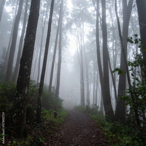 © NawasenaRid, Obraz premium Dense Forest with Tall Trees Along Foggy Path in Overcast Weather