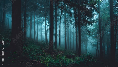 Naklejka premium Dense Forest with Tall Trees and Fog Creating an Eerie Atmosphere in Dim...