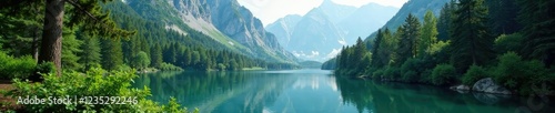 © Phetthanousack, Fototapeta premium Dense forest with towering trees surrounding tranquil lago di Braies lake, tranquility, trees, forests