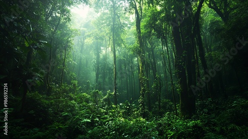 Obraz premium Dense forests filled with towering trees that thrive in tropical climates, where rainfall is abundant.