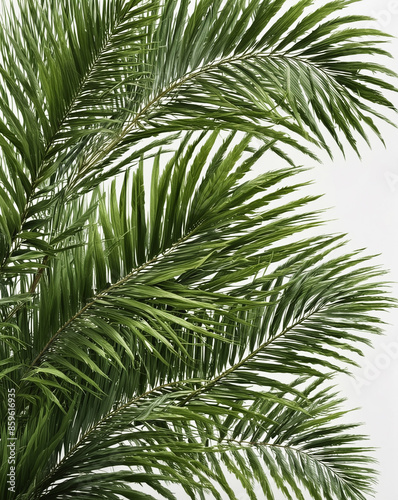 Fototapeta premium Dense Green Foliage of Palm Tree Against Light White Background