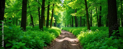 Obraz premium Dense green foliage surrounds a winding dirt path, wilderness, dry forest,...