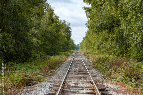 © Yi, Fototapeta premium dense green forest under cloudy blue sky with a railroad run through the centre lead to far end.