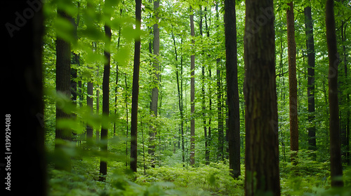 © Parsudi, Fototapeta premium Dense Green Forest With Sunlight Filtering Through Trees