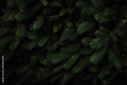 Obraz premium Dense green pine foliage and dark moody fir tree branches create a mysterious background atmosphere