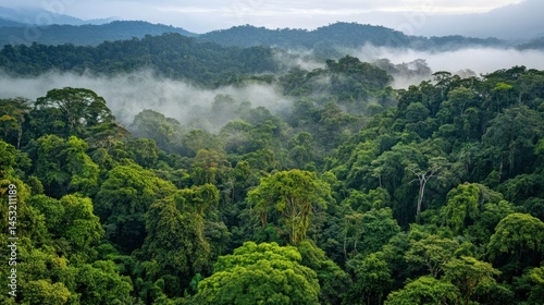 © lestari, Fototapeta premium Dense green rainforest covered in clouds on a cloudy day