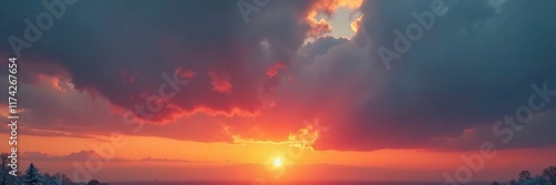 © Temteen, Fototapeta premium Dense grey clouds above orange hues of a winter sunset, texture, atmosphere, sunset
