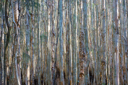 Obraz premium Dense growing paperbark eucalyptus tree forest closeup.
