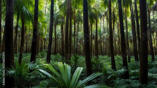 © KAThakshala, Obraz premium Dense Jungle Beauty: Panoramic View of Euterpe Edulis Palms with Light and Shadows
