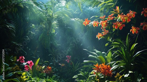 © Pannin, Obraz premium Dense jungle canopy filled with rich botanical details and exotic flower blooms.