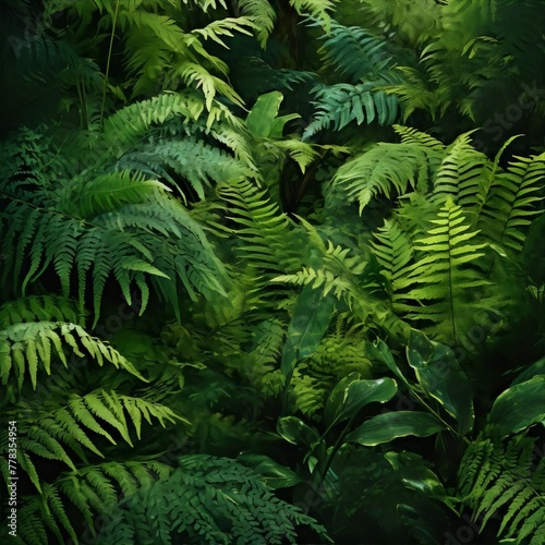 Fototapeta premium Dense jungle foliage, vibrant green ferns.