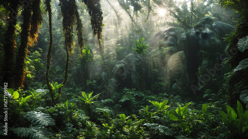 Obraz premium Dense Jungle Sunlight Rays Tropical Forest