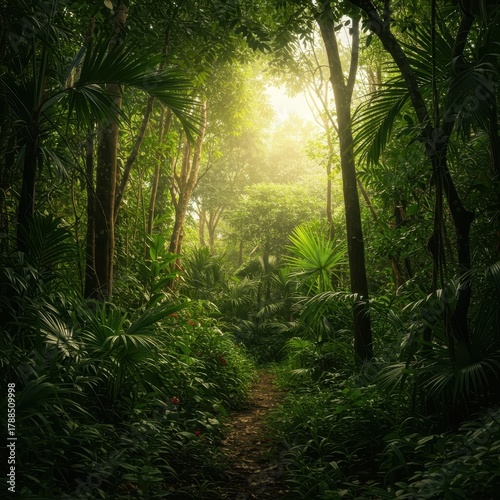 Fototapeta premium Dense, lush tropical jungle environment showcasing vibrant green foliage and biodiversity, illuminated by warm sunlight filtering through the canopy, conservation, summer, humid