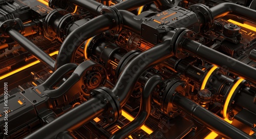 Fototapeta premium Dense Mechanical Network of Pipes and Gears with Glowing Orange Highlights –...