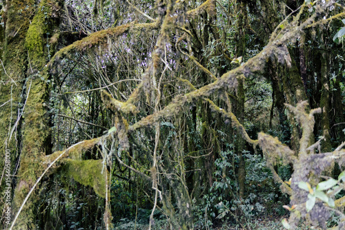 Fototapeta premium Dense moss-covered branches in a humid forest environment.