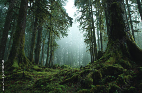 Obraz premium Dense moss-covered forest with towering ancient trees and lush green undergrowth in a misty environment